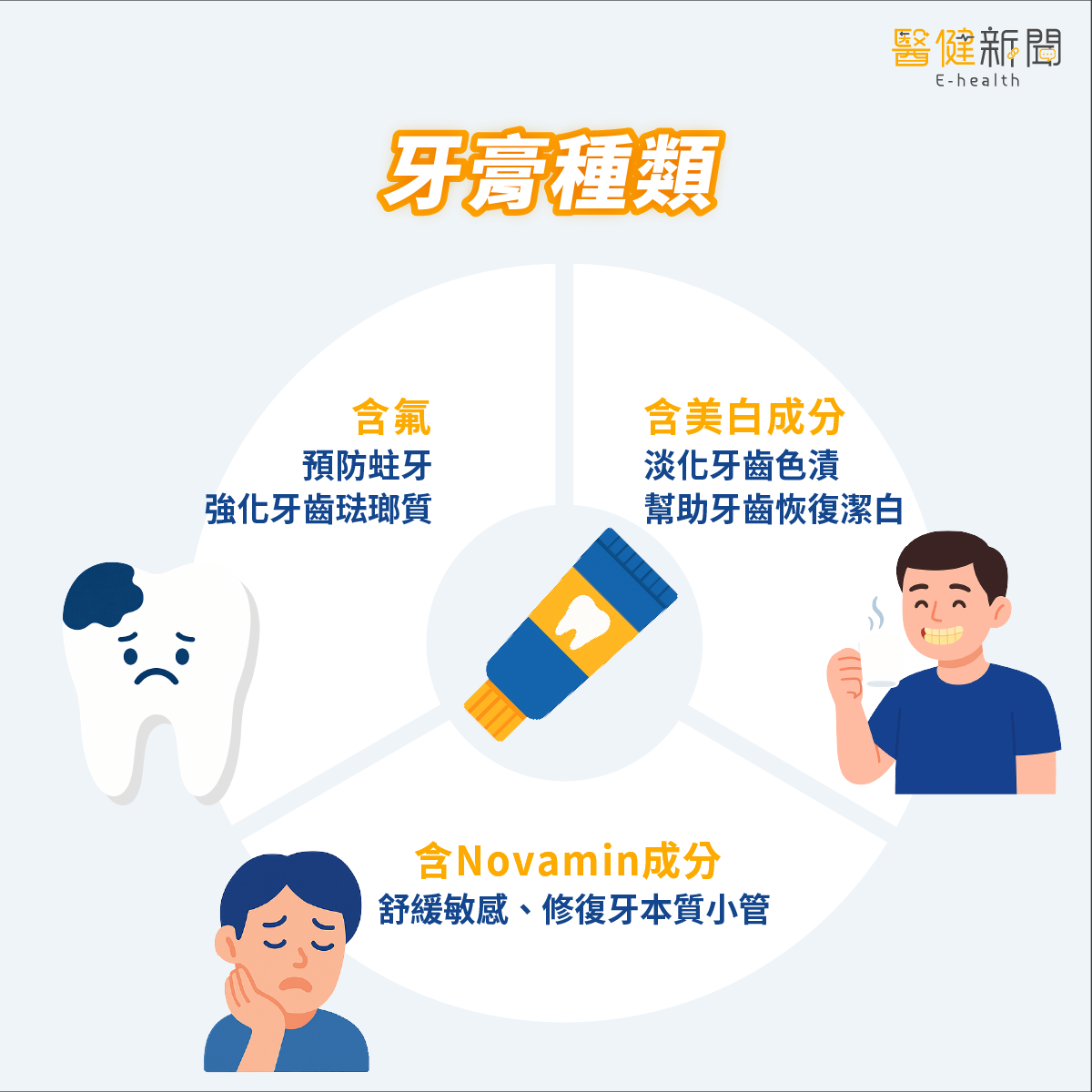 民眾可因應自己不同的牙齒問題與需求,選擇不同功能的牙膏,以下也為大家整理各個牙膏的種類與功能: