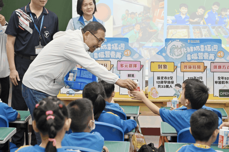 新北市長侯友宜今(23)日前往板橋國小關心學生營養教育課程,並宣布自明(115)年2月開學日起,全面啟動「鮮奶幸福週」計畫。他表示,這項政策預計將讓33萬名學幼童每週可以免費喝鮮奶或豆漿,補充成長所需的鈣質與蛋白質,長得更高更壯。