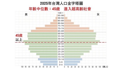 國發會在2024年11月發佈的人口學,台灣只花7年即進入高齡化,意即2025年就進入超高齡化20%;國發會預測在2035年高齡化比例達27.7%,由此數字推算,到了2070年高齡化比例46.54%,換言之,台灣人口結構將從金字塔型轉為「倒金字塔型」。