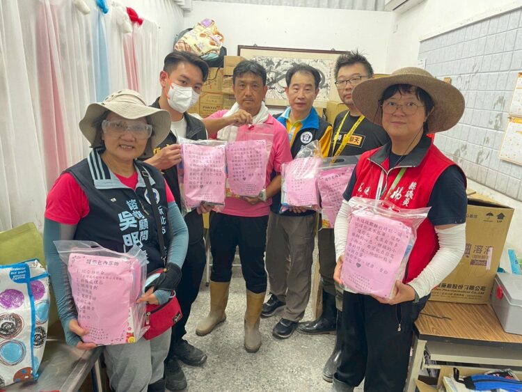 ▲花蓮縣議員楊華美(左一)率志工群發放災民「護你包」。