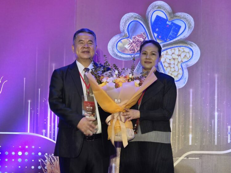 ▲宏潤生技董事長陳衫潤(中)獻花祝福太太連崢珊首度上台分享抗癌歷程,女兒(左)也上台分享喜悅。(圖/記者范振和攝,下同)