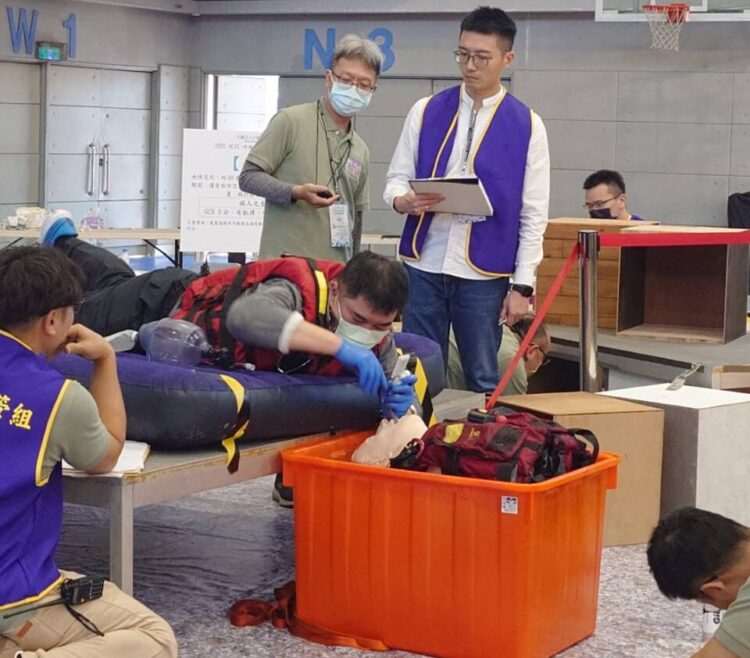 預賽以呼吸道異物梗塞為主題,內容涵蓋患者擺位、異物排除與進階呼吸道建立。代表隊流程確實、判斷精準,以高度專業手法獲得評審一致肯定, 順利晉級決賽。決賽採水災情境模擬,操作內容包含DAI(Drug-Assisted Intubation)活人插管及水中困難姿勢插管。代表隊在高壓與不良環境中保持冷靜,展現真實場域的高階救護能力,最終脫穎而出。