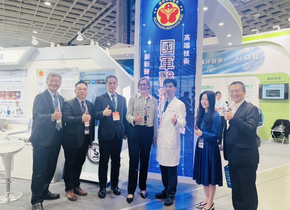 12/5日下午「國際健康成果衡量聯盟(International Consortium for Health Outcome Measurement, ICHOM)」Jennifer Bright執行長偕同生策會錢宗良執行長及張益華營運長蒞臨國軍醫療體系展區,由軍醫局醫計處廖敏策副處長帶領三軍總醫院國際醫療中心方文輝主任及心臟內科劉威廷主治醫師介紹「胸部X光伺機性篩檢平台輔助診斷多項疾病」與「AI心電圖守護者:降低院內心血管死亡事件」,展現軍醫如何應用AI、大數據等技術持續精進醫療專科研究,期透過本次交流拓展更多合作機會。