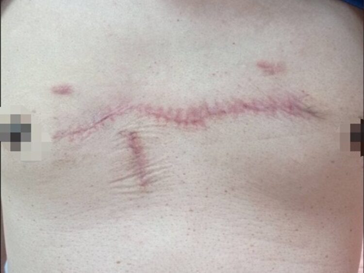 經2個月悉心治療,這名患者胸部疤痕明顯改善,不僅外觀恢復,重新找回自信。陳主任表示,外科手術結合原生基質膜/羊膜生長因子是一項安全且有效的治療選擇,能提升傷口正常癒合能力與患者生活品質。