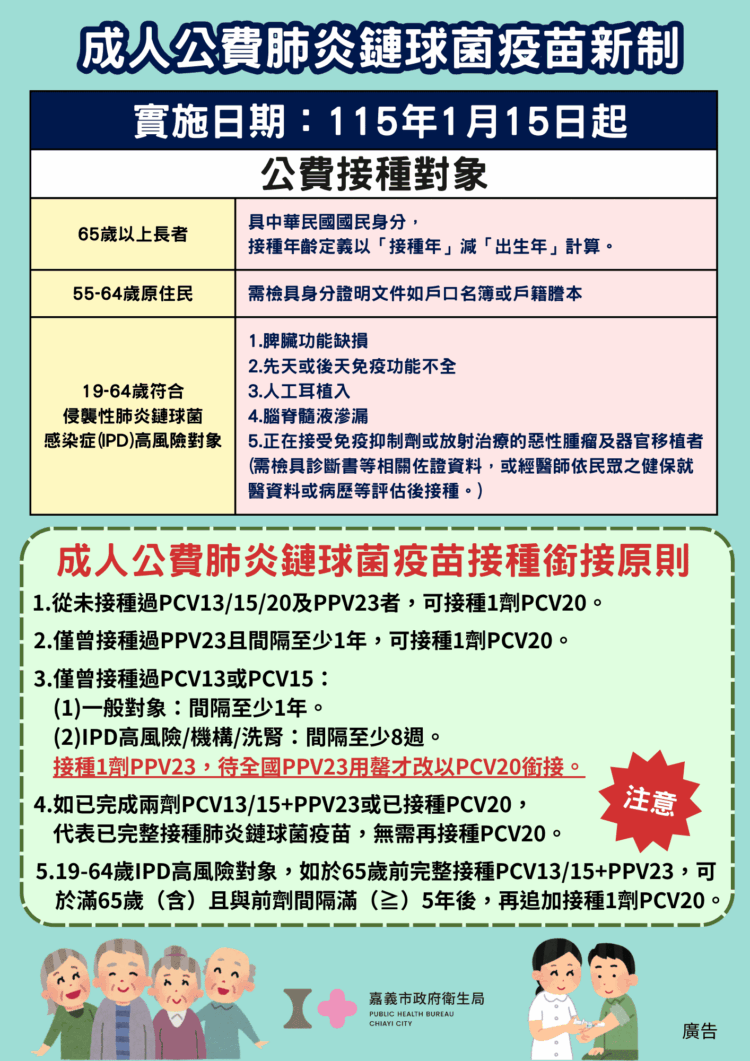 嘉義市衛生局長廖育瑋指出,公費接種對象包含65歲以上長者、55至64歲原住民,以及19至64歲侵襲性肺炎鏈球菌感染症(IPD)高風險族群。依接種史不同,將提供相應接種建議,例如從未接種者可直接接種1劑PCV20;曾接種PPV23或PCV13/15且符合間隔條件者,亦可依規定銜接接種,確保獲得完整免疫保護。
