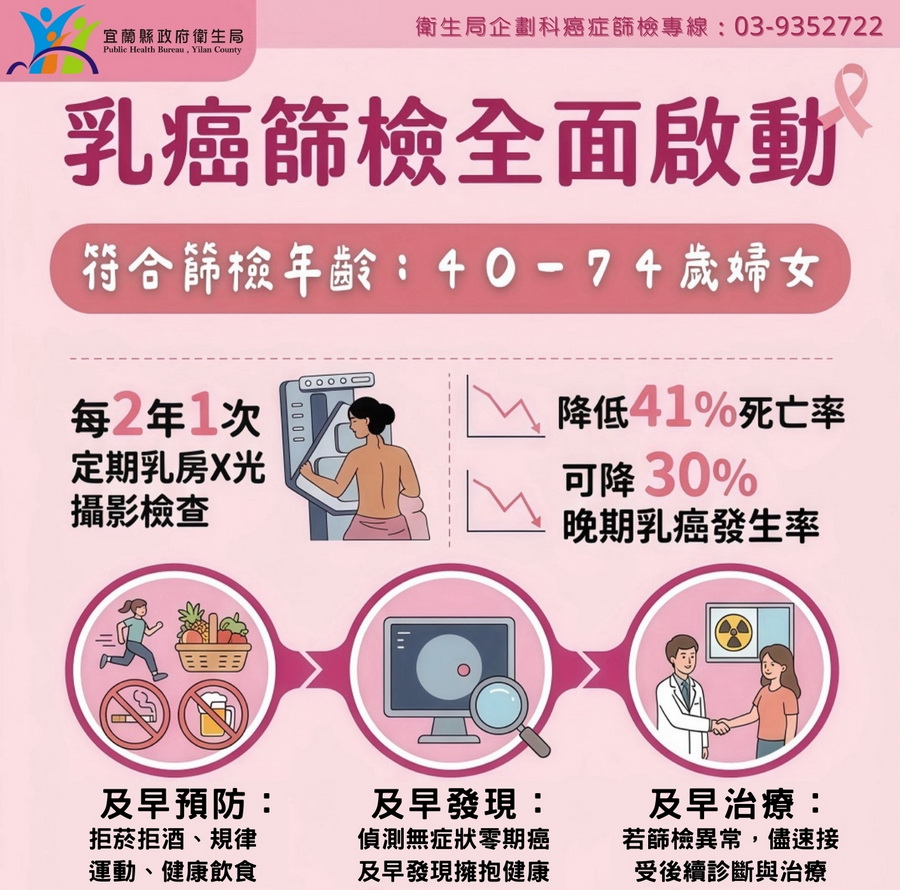 乳癌在我國女性癌症中的發生率高居首位,定期篩檢有助於早期發現、提高存活率!宜蘭縣衛生局再於婦女節提醒婦女朋友,養成定期篩檢的習慣,早期發現,及時治療。