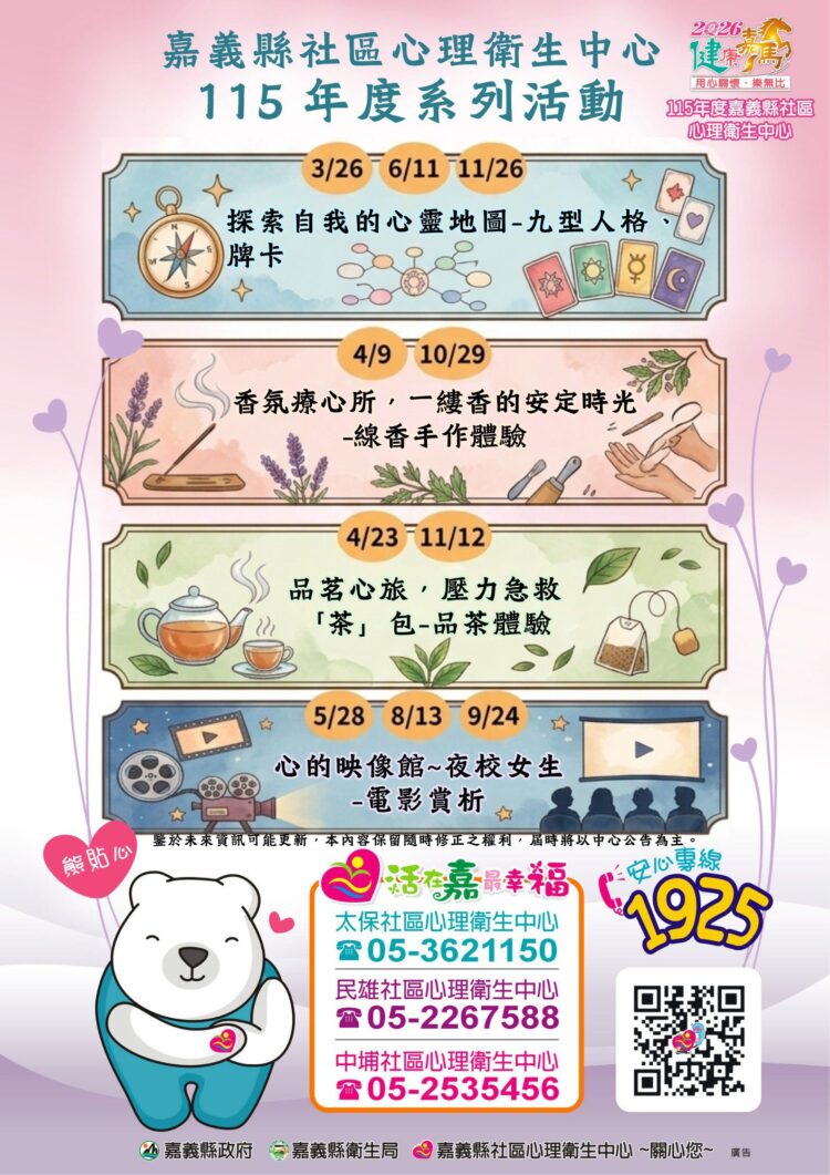 趙紋華表示,隨著生活型態快速變化,心理壓力來源日益多元,縣內設有太保、民雄、中埔三處社區心理衛生中心及服務專線3621150,希望透過推動社區化、在地化的心理衛生服務,落實「活在嘉 最幸福」的施政願景。如有活動相關資訊想了解,都可電洽嘉義縣社區心理衛生中心專線05-3621150或1925安心專線。